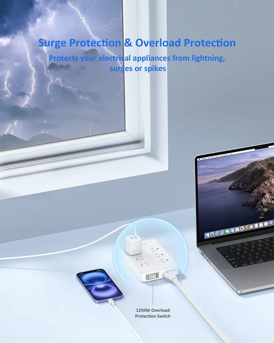 • Surge protection. Charge multiple devices safely.