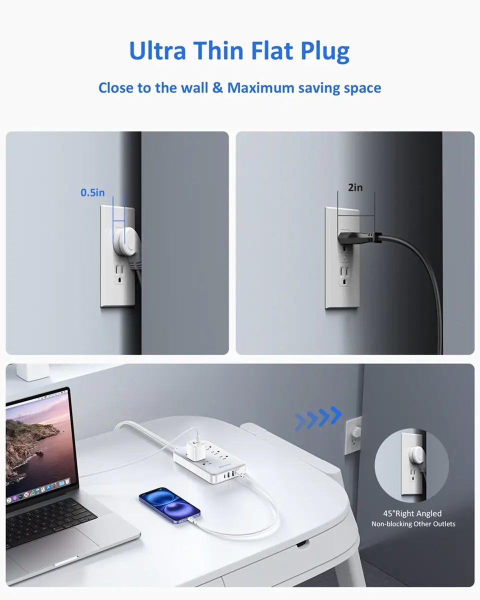 • Slim Flat Plug Design – 45° angled ultra-slim plug fits tight spaces without blocking other outlets.
