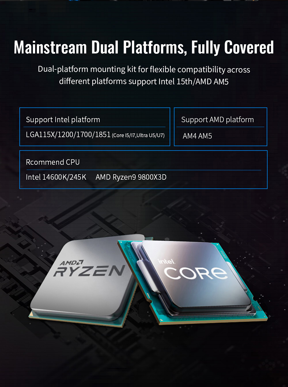 | Platform | 1.Intel LGA115X/1200/1700/1851 Core I3/I5/I7 2.AMD AM4/AM5 |