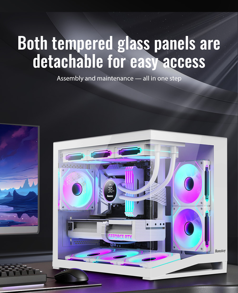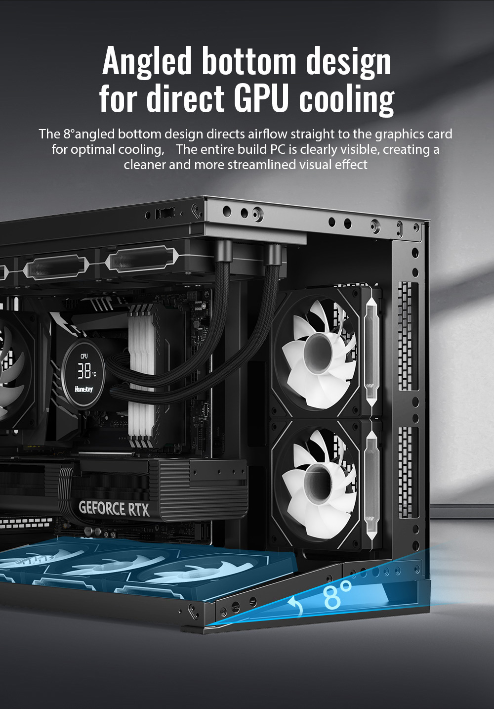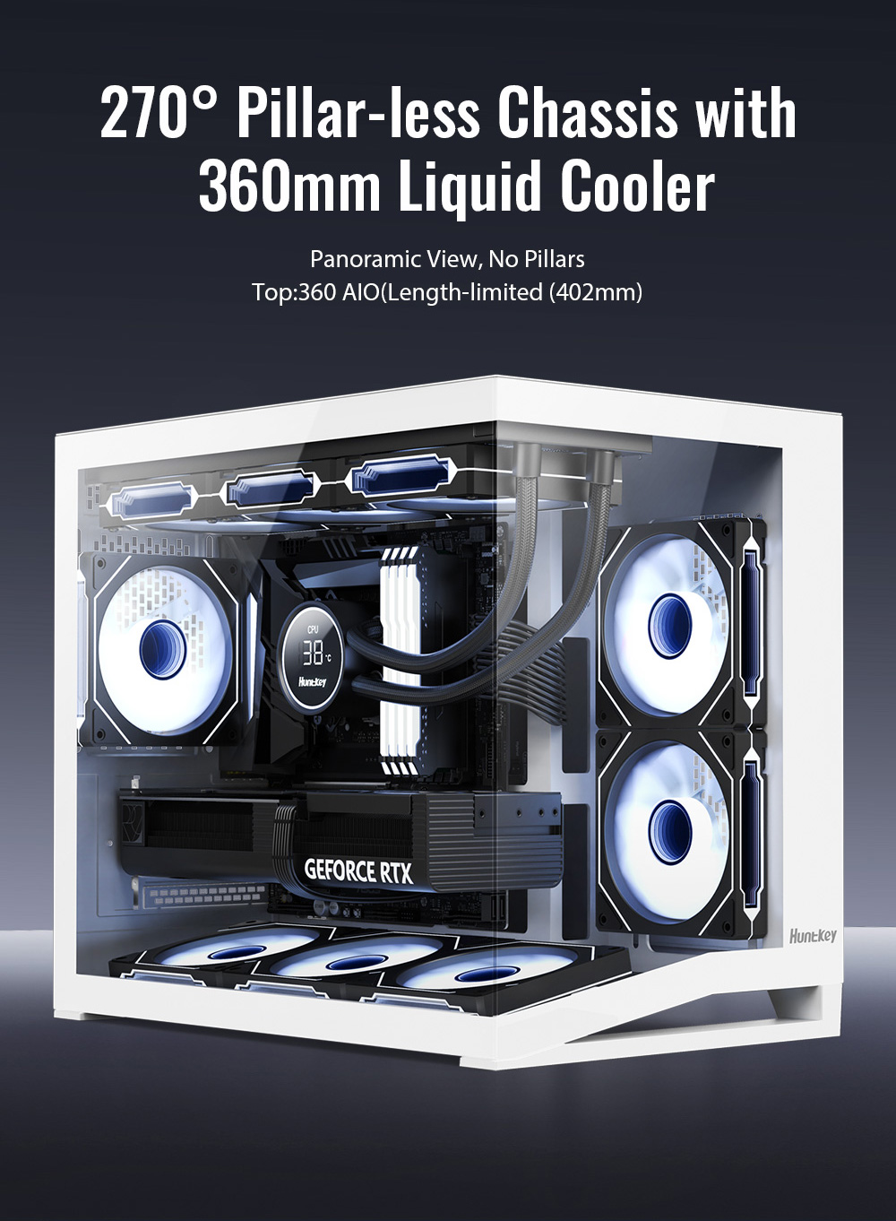 | Key Features | 1.270°full view tempered glass 2.Angled fan mount at the bottom 3.Support system fans*9 4.Top 360 liquid cooler long-limited 402mm |