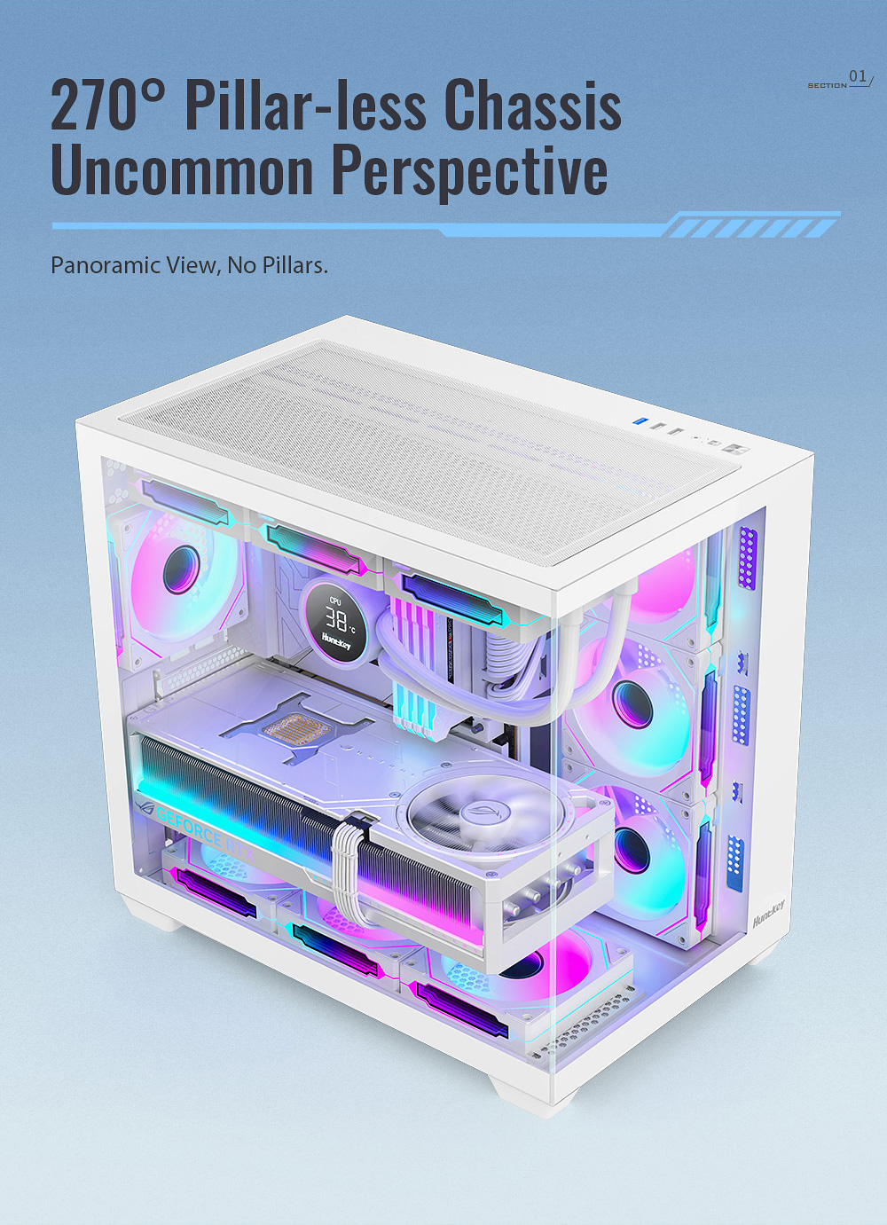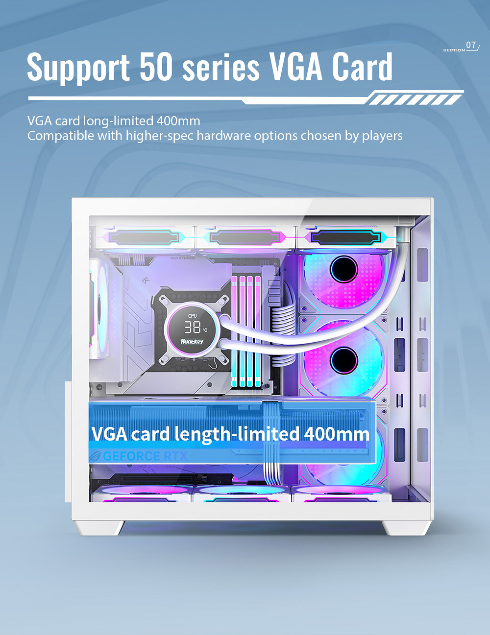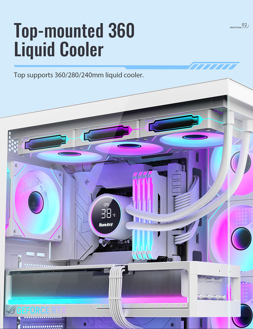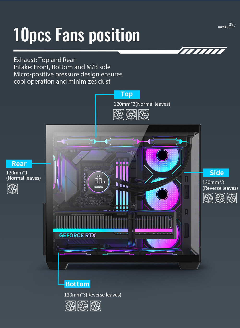 | Key Features | 1.270°full view tempered glass 2.Support ATX M/B,compatible with VGA card with 3 fans 3.Support system fans*10 4.Top 360 liquid cooler long-limited 405mm |