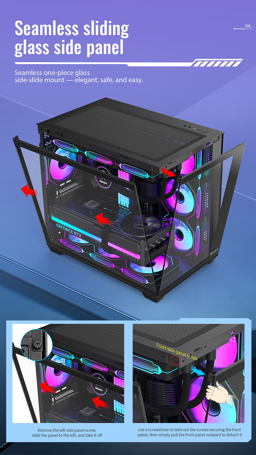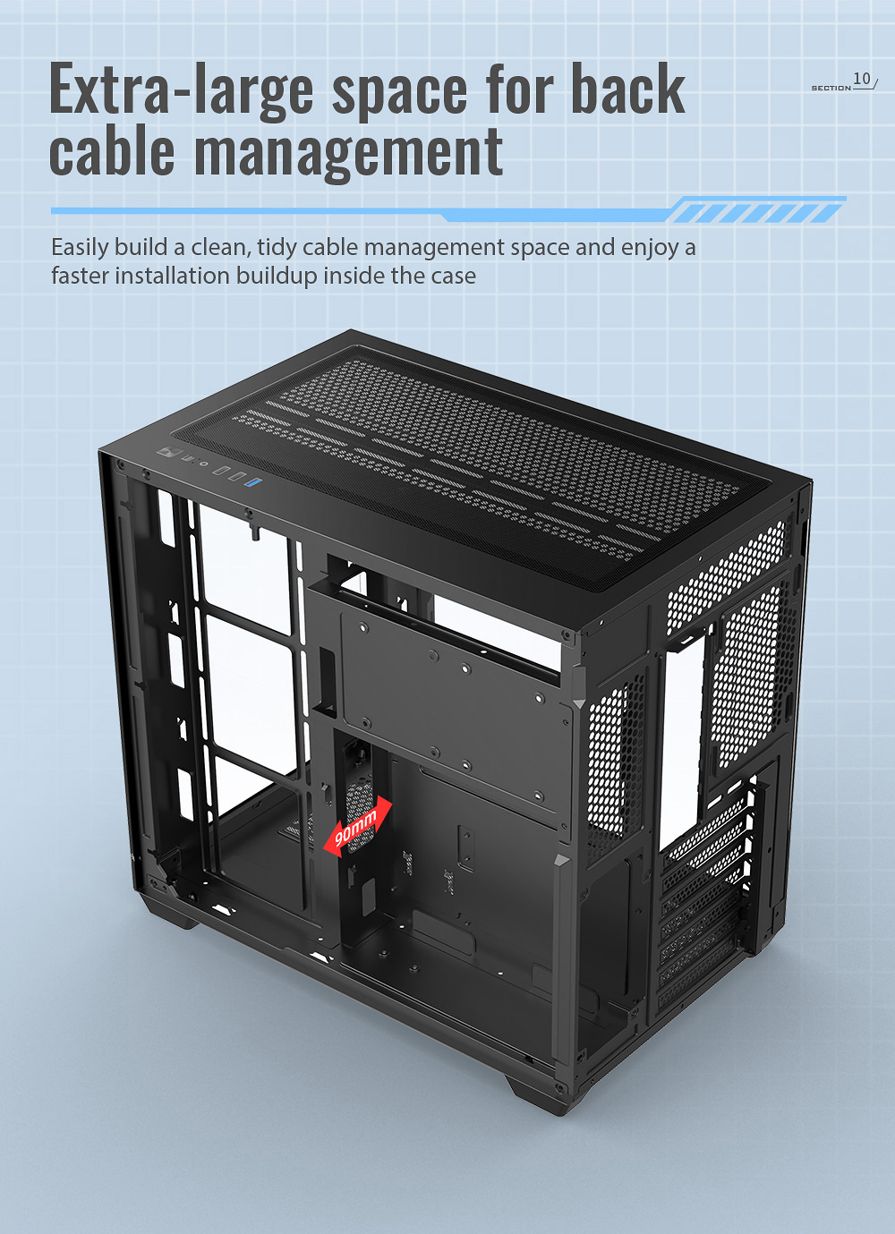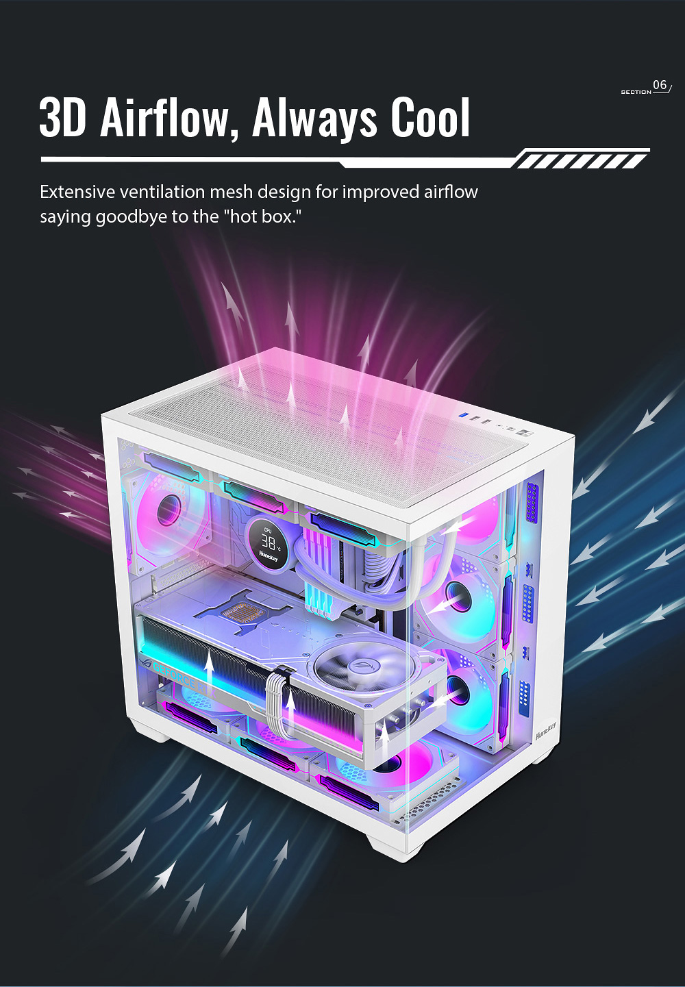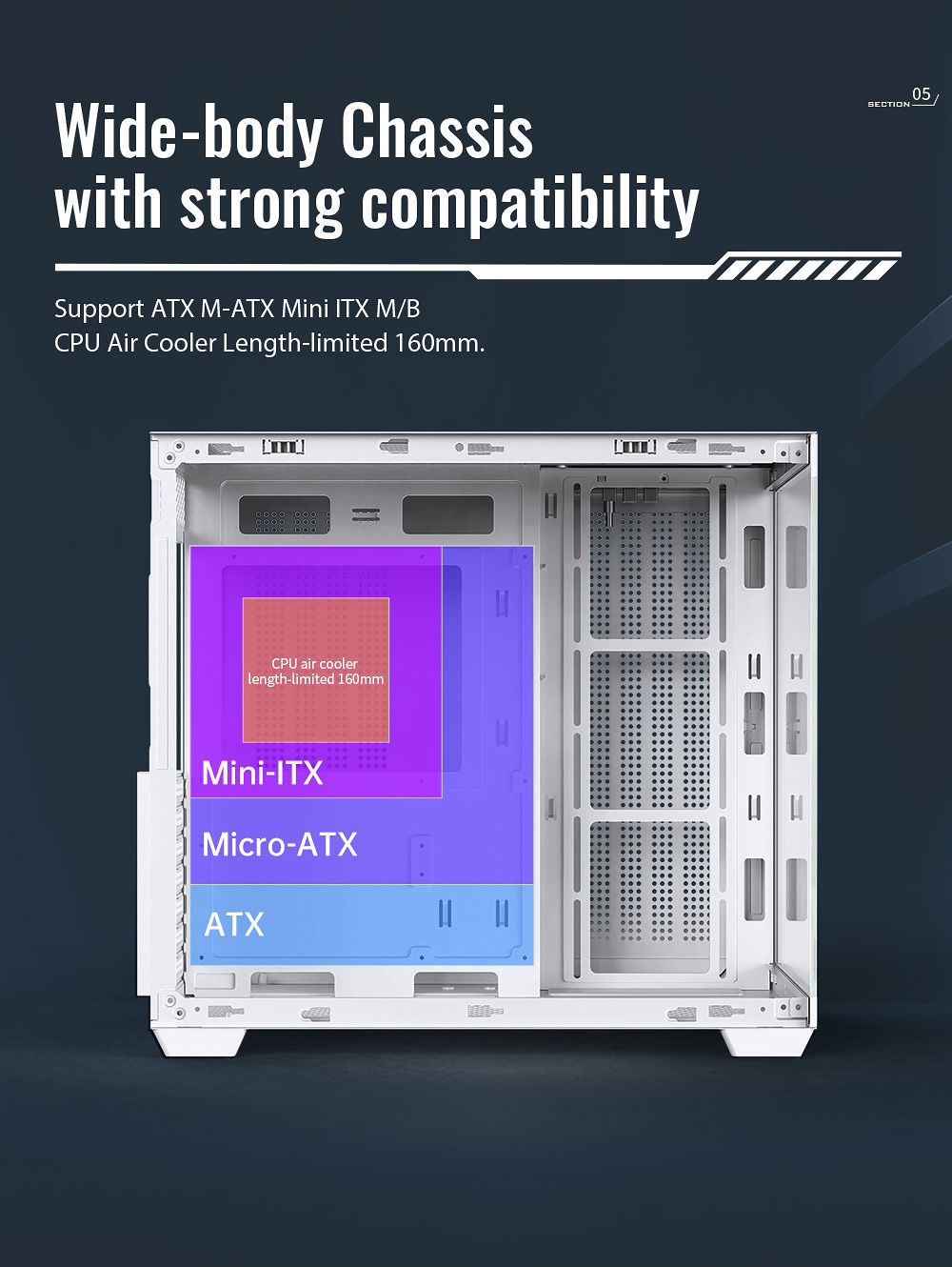 | Key Features | 1.270°full view tempered glass 2.Support ATX M/B,compatible with VGA card with 3 fans 3.Support system fans*10 4.Top 360 liquid cooler long-limited 405mm |