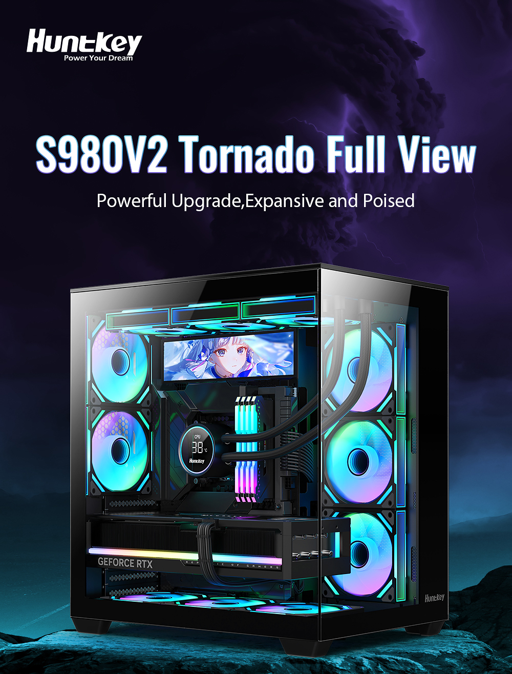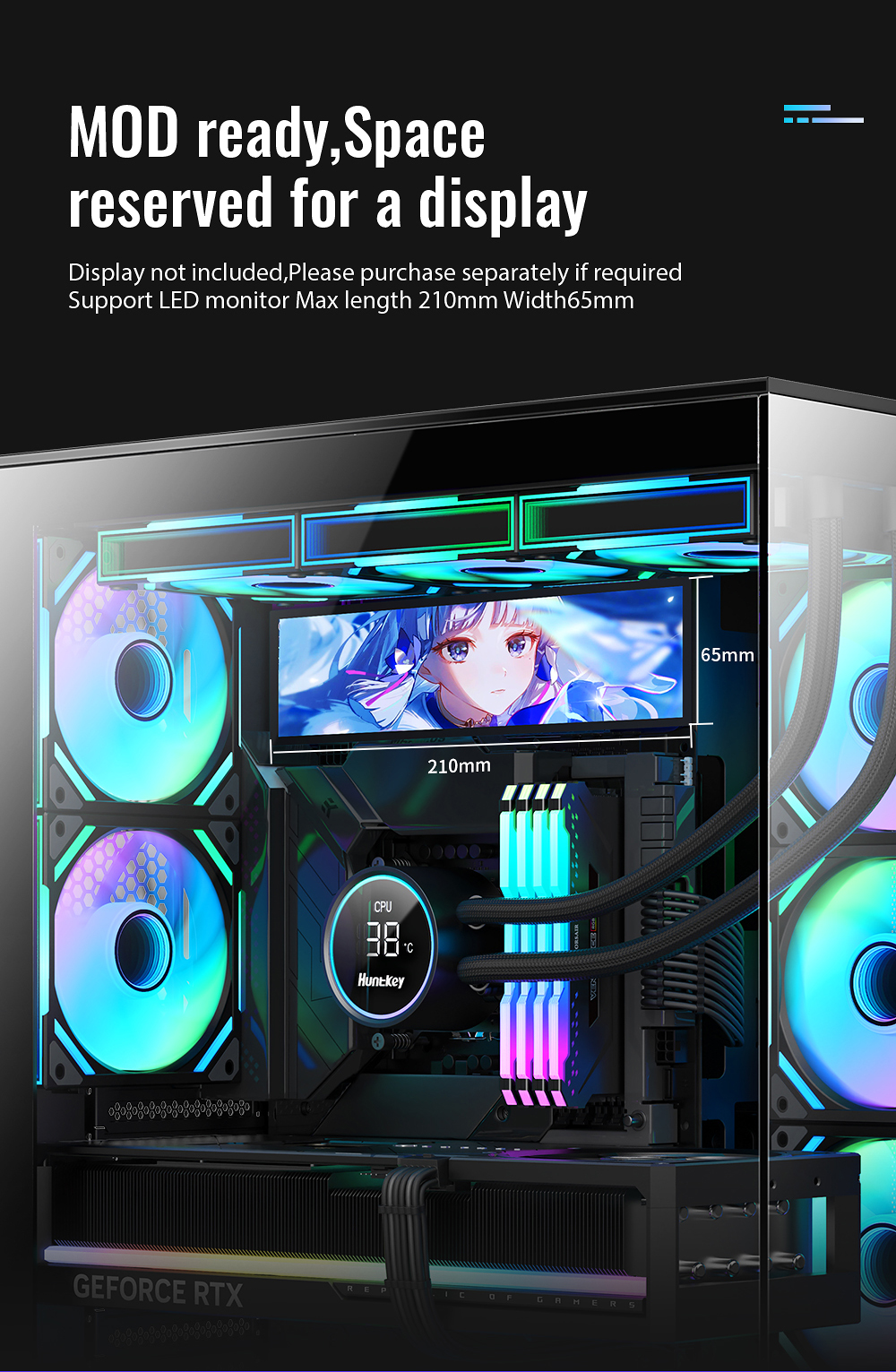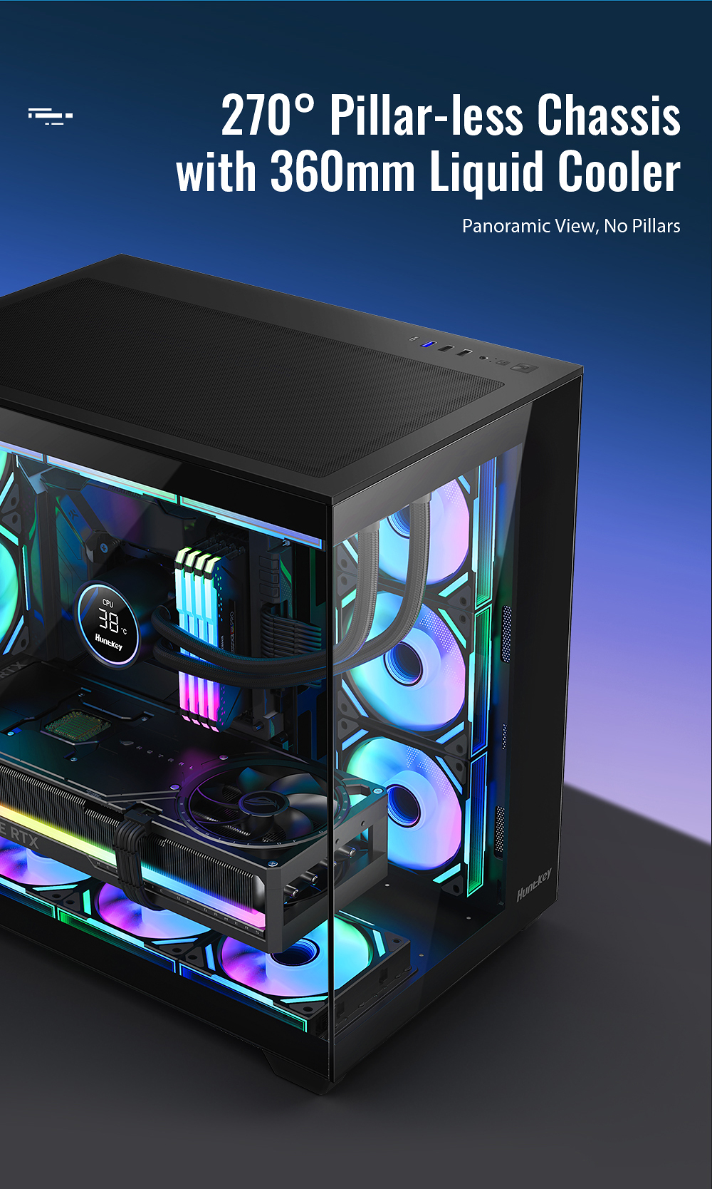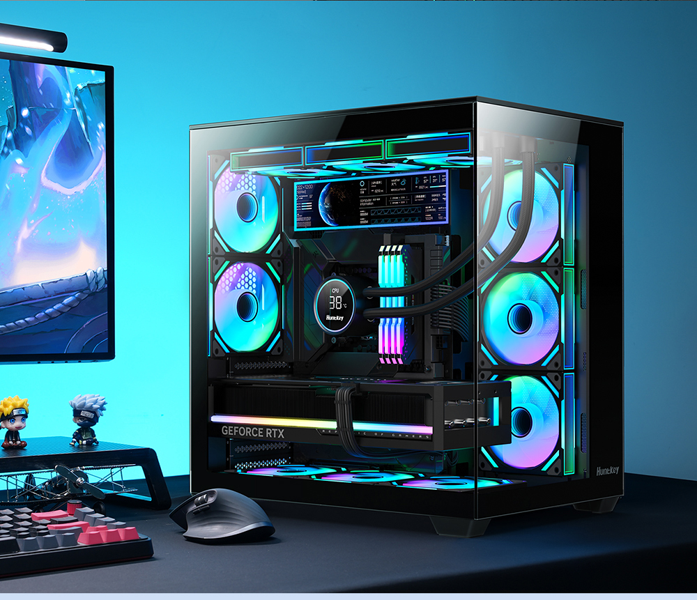 | Key Features | 1.270°full view tempered glass 2.Support ATX M/B,compatible with VGA card with 3 fans 3.Support system fans*11 4.Support dual 360 liquid cooler top or side 5.Support MOD monitor Max 8inches |